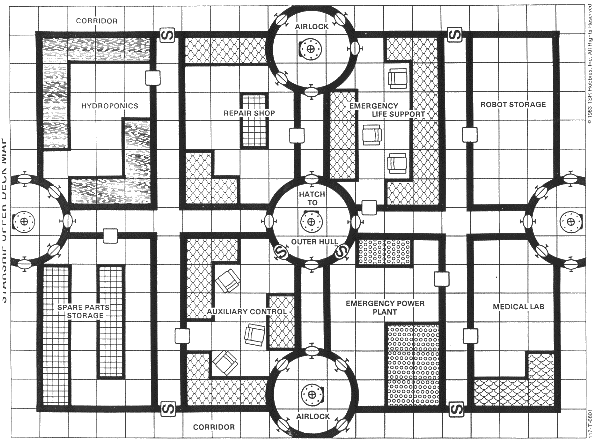 The Starship Upper Deck Map has been designed to be used with the Starship Bridge Area Map in the STAR FRONTIERS boxed set. The scale of the upper deck map is the same as that of the Starship Bridge Area Map (2 meters per square).