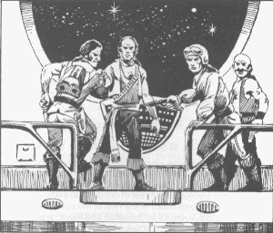 contact and learn as much about them as possible. The first expedition to Volturnus disappeared without trace as soon as it entered the Zebulon system. If possible, you are to locate and rescue any survivors of this mission. As you boarded the starliner that would take you to Volturnus, the steward gave you an interior plan of the starship and urged you to study it carefully. He also searched your luggage and placed all weapons and power packs in the weapons locker. His assistant placed your other heavy gear, such as the military skein-quits given to you by the government of Truane's Star, in the cargo hold. The only items you were allowed to take to your tiny cabins were your non-weapon tool kits. |