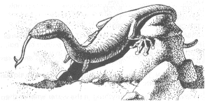 DESCRIPTION: The shovelmouth is a four-legged reptile with a long, flat snout resembling a shovel. It uses this snout to scrape moss and fungi off the walls and floors of the caverns it inhabits. Shovelmouths breed in great numbers, but their population is kept in check by rasties, which prefer them as food.