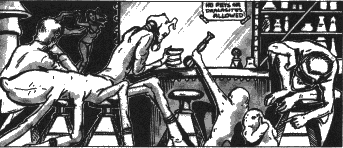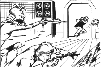 | After filing our reports with our contact at the Pan-Galactic Corporation, C'hting, Bakchu and I drove to the Spacer's Rest to celebrate over a few mugs of thick Yazirian ale. We were discussing what we would dowith the 100 credits each of us had earned for the mission when all three of our communicators signalled incoming calls at once. Bakchu snarled in dismay when the face of Beren Tiu, our contact at PGC, appeared on the tiny screens. "Ah, I'm glad I've got all of you together," he smiled. "Nice job on Dalmor, though it's a shame you had to shoot him in public. I calied to tell you that while we were interrogating him we got a lead on a lime job you might...'' "Hold it, Beren," I growled. "You promised us we could take a week off aher this mission and, by the stars, I'm going to take a week off!'' C'hting and Bakchu rumbled in agreement, and Tiu looked disappointed. ![]() "All right," he said, "if you're not interested in 200 credits I'm not going to force you to..." Two hundred credits! The three of us looked at each other, and Bakchu curled his lips in a knowing smile. "What's the job?" I asked. |