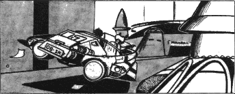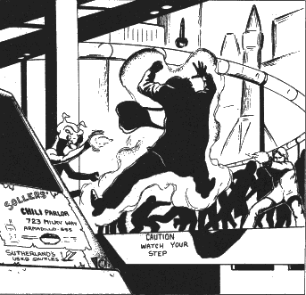 The thought was still in my mind when one of C'hting's arms flashed in a lightning-swiff draw. I dived to the floor as Datmor swung his pistol, but the needles whizzed harmlessly past C'hting and me. C'hting's laser beam only grazed Dalmor as he dashed out the door. We charged aher him, but my curse was echoed by C'hting as we watched Dalmor leap aboard the monorail.![]() |