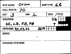 The sample below shows how the form should be filled out for a typical light cruiser. The area of boxes can be used to mark off LTD weapons. The light cruiser on the sample form carries six rocket batteries (RB), four torpedos (T), and eight interceptor missiles (ICM). Unused boxes are darkened or crossed off to show that they are not available.