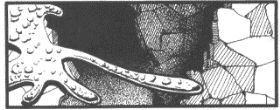 Because of its amoeba-like body, projectile weapons will not affect the dropper. It is also immune to the effects of tangier grenades,. for it simply oozes out of the tangier strings. Since the dropper never sleeps (even if artifically stimulated), doze grenades will not' affect it, either. In addition, any person using a ranged weapon attacks at -10 due to the dropper's ability to blend with its natural) rock surroundings (droppers cannot even be seen from distances greater than 5 meters). Very bright light will cancel the effects oft the dropper's camouflage.