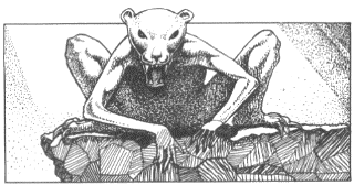 DESCRIPTION: Rasties are vicious mammals of medium size that prey upon hapless shovelmouths and other gentle prey living in the caverns of Volturnus. They average 1 meter in length, and look like a cross between a rat and a small monkey. They have four legs, but can sit upright and use their forelimbs to grasp meat or small prey. Rasties are usually hungry, and will attack anything that looks edible to them.