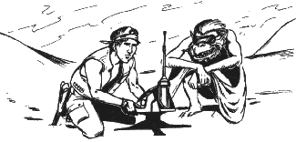 The players have enough water to last 25 turns. Each turn the players must subtract 1 from their water supply. If their water supply reaches zero, they are out of water and wili pass out. Before this happens they want to find a radio beacon that was torn off their ship in the crash. With it, they can radio for heip. The reader picks a space where the player characters start and secretly picks another space at least 10 spaces away where the beacon fell.