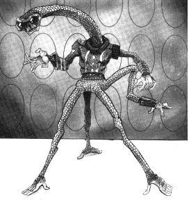 The Osakar head is set slightly forward of the shoulders on a long, thick, muscular neck. This neck can turn the head straight back, so the Osakar can easily look behind itself. The Osakar head has a very flat face with little detail. The two eyes are totally black. The nose is an intricately baffled vertical opening. The mouth is a mere slit containing hard, bony ridges used for chewing. Two opposing tongues, one on either side of the mouth, can be seen.