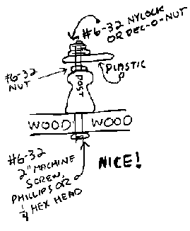 When rebuilding playfields, I run #6" Studs through the playfield from the bottom! Then I put the post and plastic on top of that and firmly nut each! Now I can endlessly take it apart to change rubber or bulbs and never wear out hole! Start with a hand held screwdriver with a #5 bit (1/8)! Drill a #5 hole from the Top Down where the original hole was! Do not use a high speed twist drill, it will burst out the bottom and chew up a wire bundle! Then use same hand held screwdriver to feed into #5 hole a 2" #6 bolt from the bottom up! Place the post on the stud, nut it with an ordinary #6 nut, put the rollover guide apron or plastic screen card on top, and elastic nut in place! If you encounter a relay or step unit in the way of your hole, just use a panhead bolt and countersink so it lays flush with the wood! Try it on one game and you'll never go back! Buy large quantities of hardware from "Fastener Supplys" in Yellow Pages or from Electronic Surplus in Dayton for $1.25 a pound!