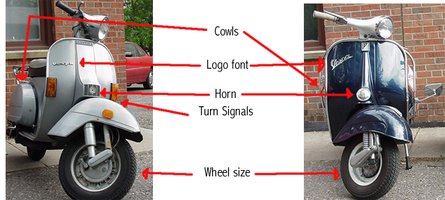 Vespa has been making scooters sincethe late 40s. When they started to produce scooters, the design was elegant, and has been continually refined through the years. Some differences aren't readily noticeable, such as engine reworkings. Locations of gloveboxes and headlight are noticeable, but sometimes hard to keep track of. For purposes of this comparison, we'll make it fairly easy- a 1964 largeframe scooter vs. a 1979 P-series. (In 1966, Vespa started to produce a slimmer, more compact version of their scooter- this is known as the smallframe. The Smallframe, largeframe, and P-series make up the majority of the Vespa body styles.) The first readily apparent feature of the P-series scooter is that it's boxier than the original series. Where the original scooter had very curvy and graceful cowls (The two 'bubbles' on the sides of the rear of the scooter) the P-series has a roughly defined angle across them. Unfortunately, the following picture doesn't have a clear picture of the largeframe's cowls, but if you look elsewhere it should be fairly obvious. Another difference is that the P-series is actually much larger than the Large-frame. This is mainly due in part to the 10" wheels that are used, as opposed to the 8" wheels on the earlier models. Yes, the 8" wheels are very small, and make the rider feel as if they're skimming on the pavement. The p-series also has a better suspension system, which along with the bigger tires, allows for a much smoother ride. On the front of the legshield, there are several more differences- in a nod to the DOT and standards for roadworthiness, the P-series scooters have turn signals- the vintage scooter rider has to rely on old-fashioned hand signals. In the early 70's, Vespa moved away from the flowing script badge that had graced the front of its product, and to a simpler block-letter affair. Also, the horn was now surrounded in a big hunk of plastic, as opposed to being a small metal horn that mounted right into the body.